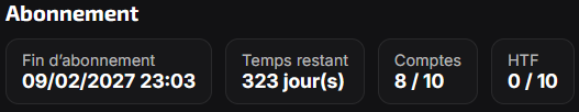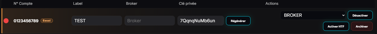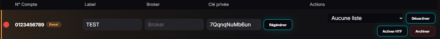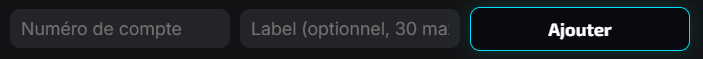 La page Gestion des comptes est la page principale pour démarrer. C'est ici que vous ajoutez votre compte MetaTrader et que vous récupérerez ensuite la clé privée utilisée par le robot et par certaines alertes.