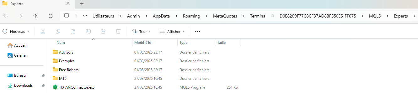 Pour un fonctionnement continu, laissez MT5 ouvert en permanence ou utilisez un VPS.