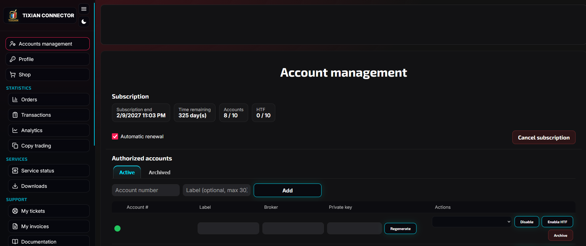 TIXIAN lets you connect a MetaTrader account, receive signals from TradingView, and track your orders and transactions directly from the Dashboard.