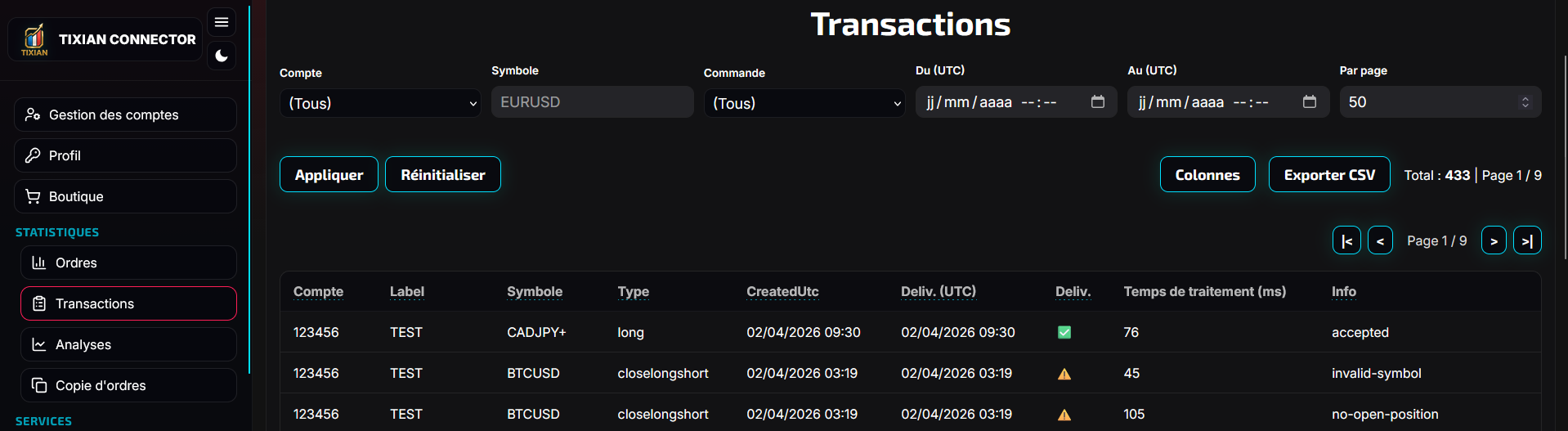The page Transactions lets you see what was actually processed.